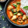 Geserveerd met rijst, sajoer boontjes en zoetzure komkommer.